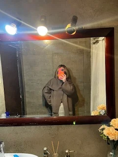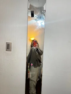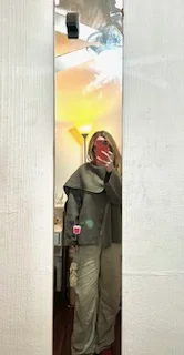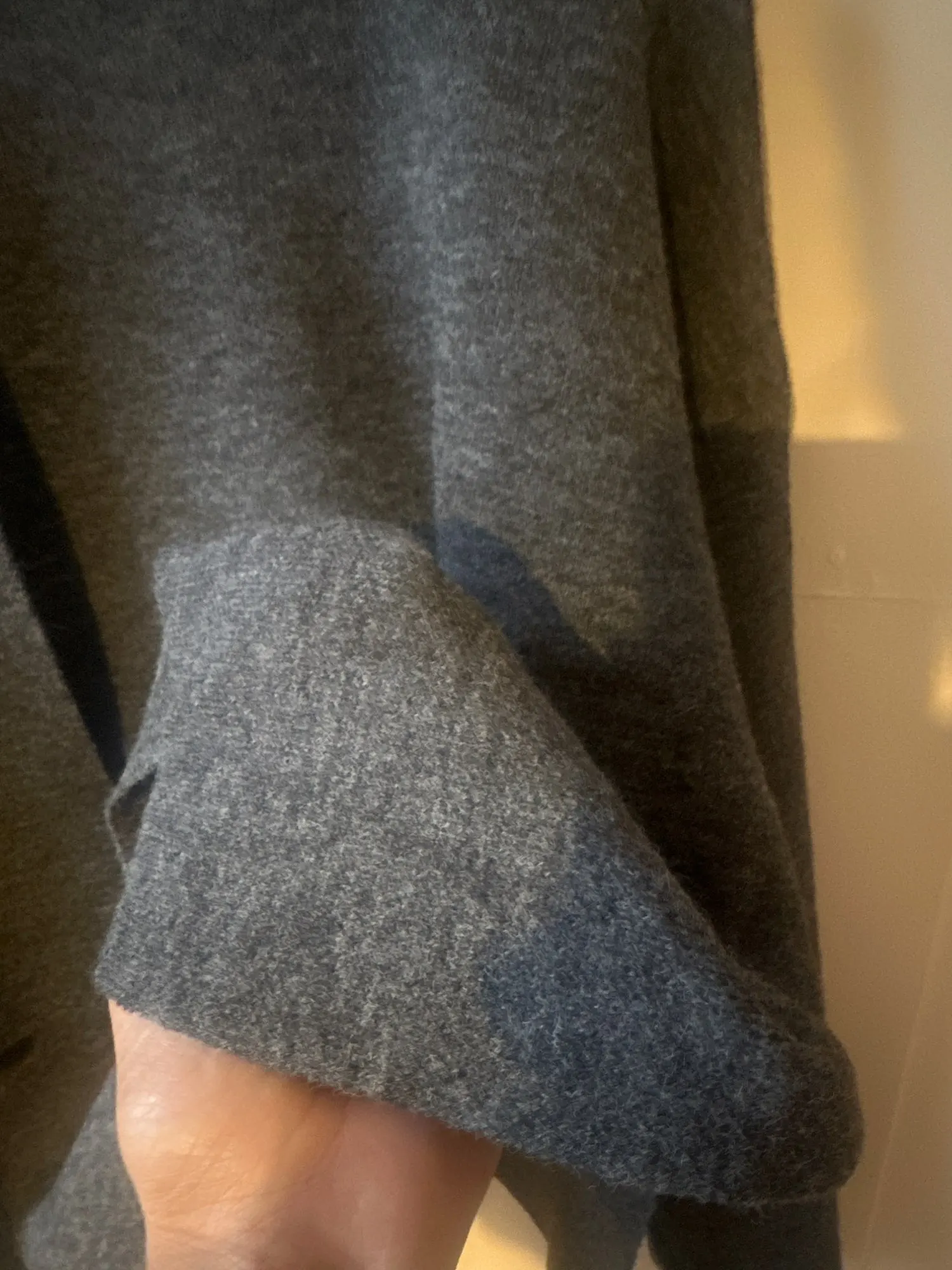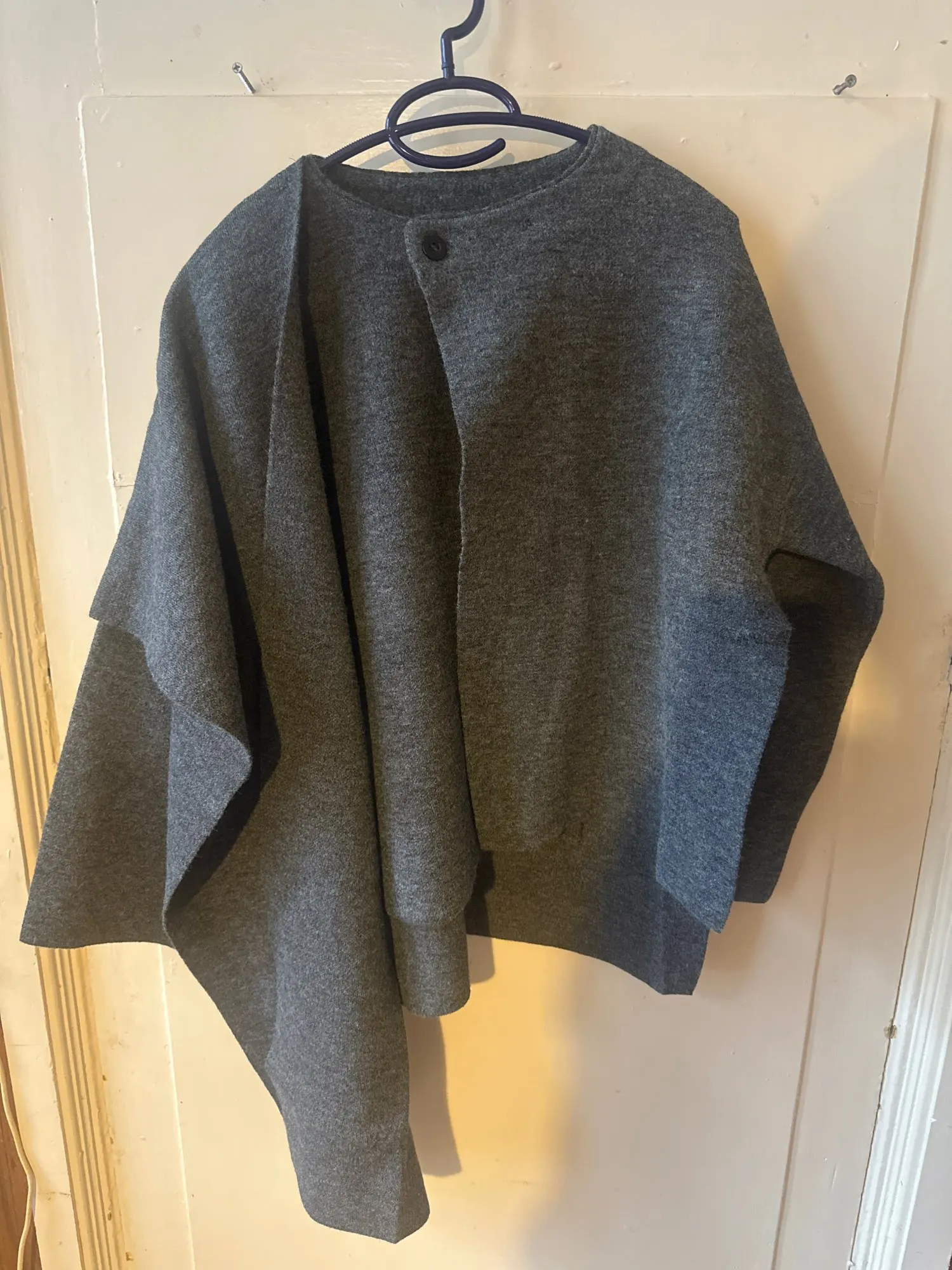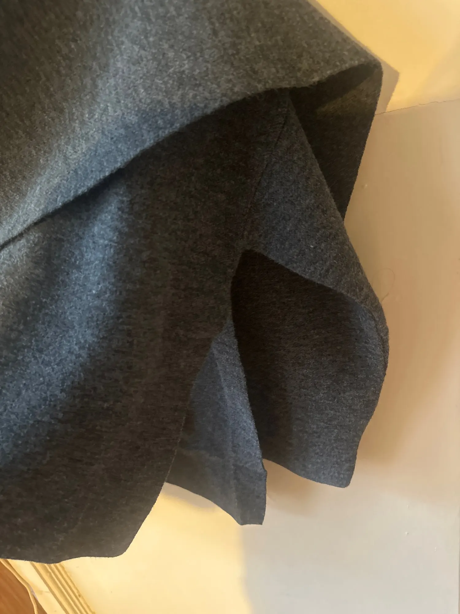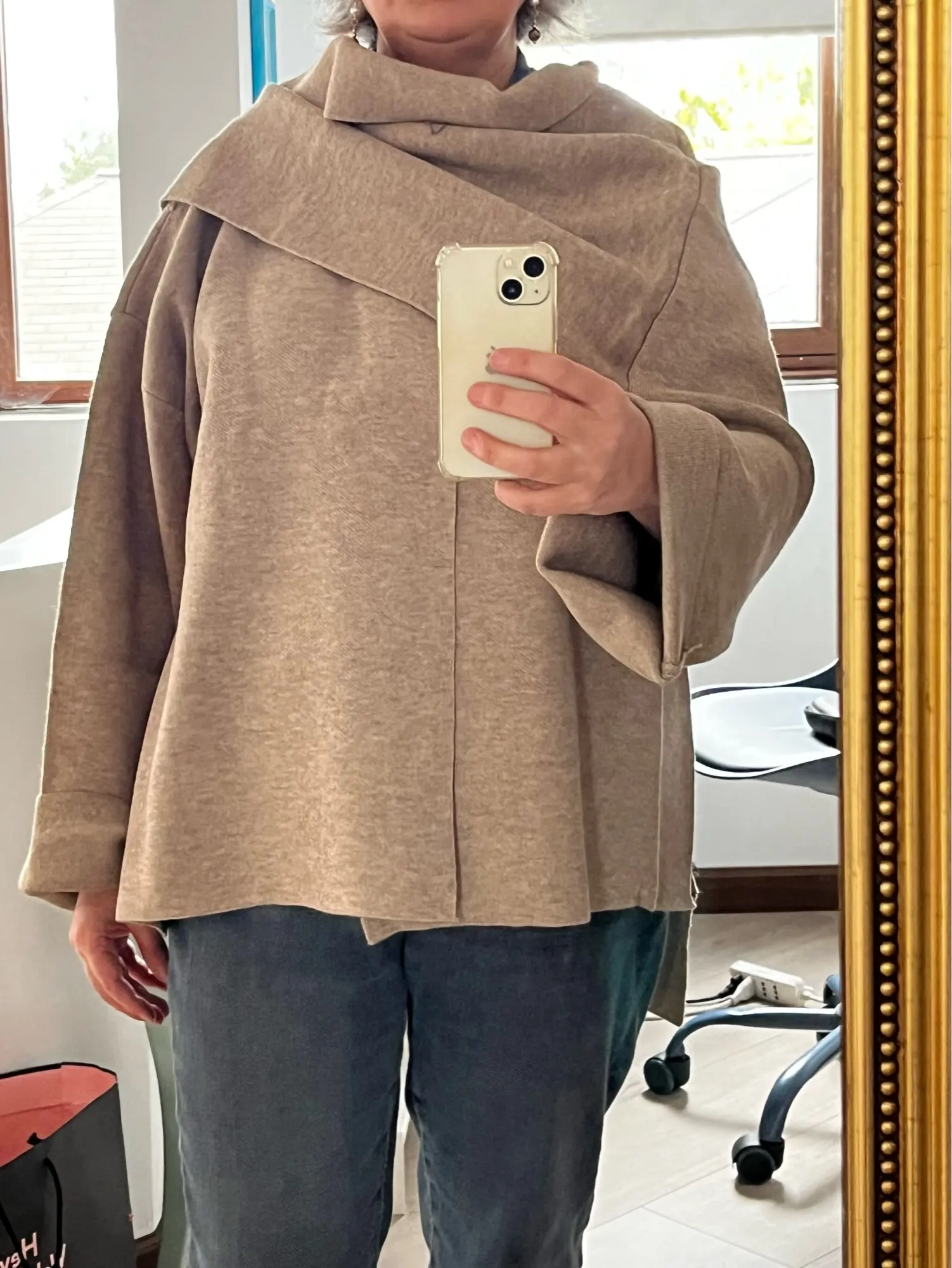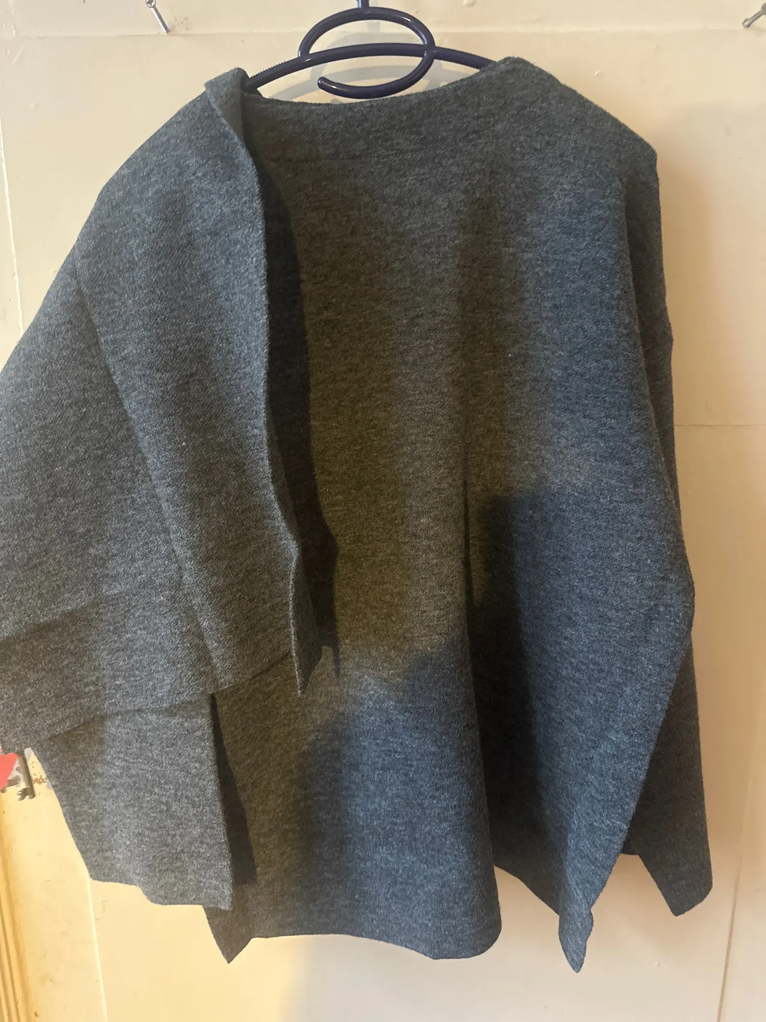 Anthelmette Pasquier Très beau! C'est juste comme ça apparaît sur la photo. Le matériau est comme de la laine. À l'avant, il se ferme seulement au cou, donc il ne ferme pas complètement, mais il est livré avec une 'écharpe' qui croise et couvre jusqu'à mi-torso supérieur.
